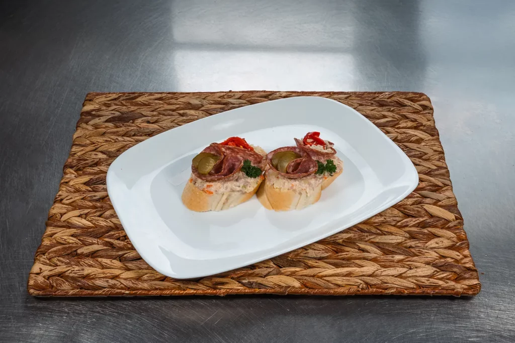bageta, turistický salám, chlebíčkový salát, sýr Eidam, kapie, okurka, petrželka