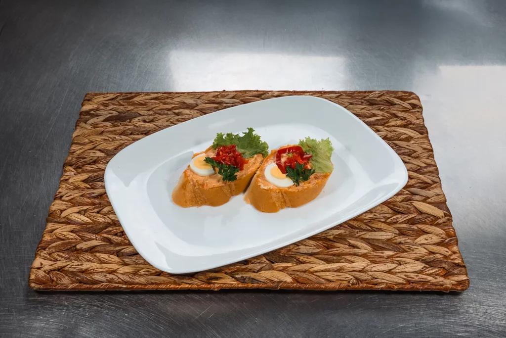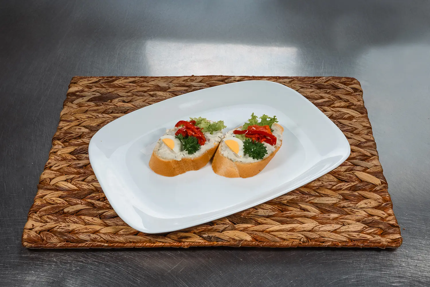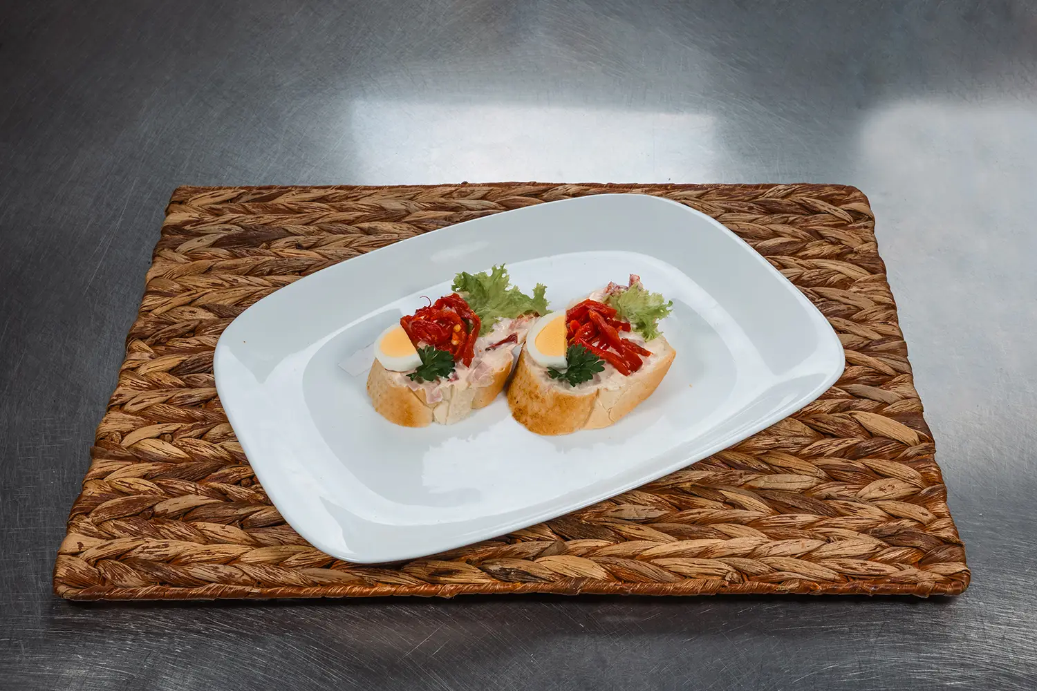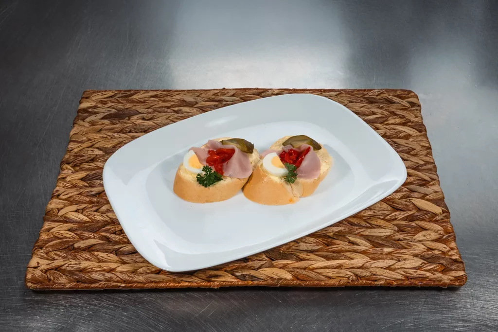 bageta, máslo, šunka standart, vařené vejce, kapie, okurka, petrželka